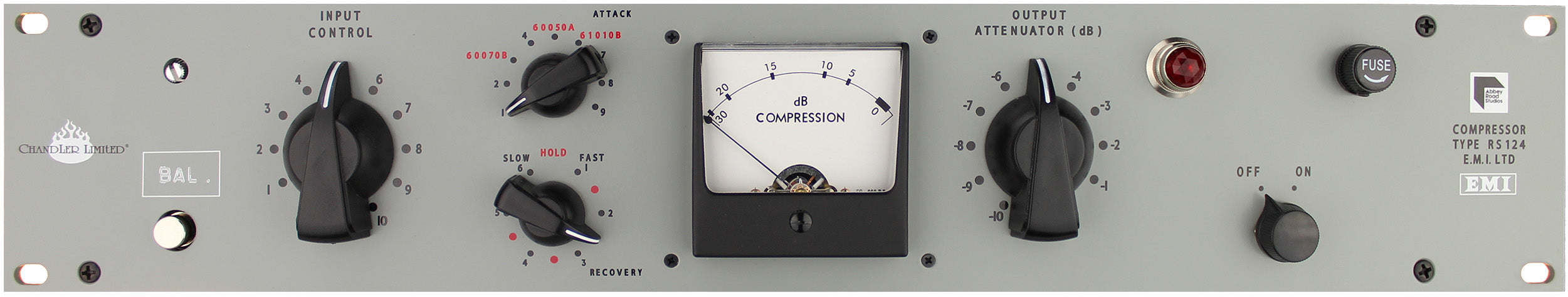 Along with features traditionally found on the original counterparts, Input control, Output attenuation, ‘Recovery’ (release) control and the unique ‘HOLD’ setting, the Chandler Limited RS124 Compressor includes modern facilities such as adjustable attack, selectable output impedance, and a special twist, dubbed the ‘SuperFuse’.