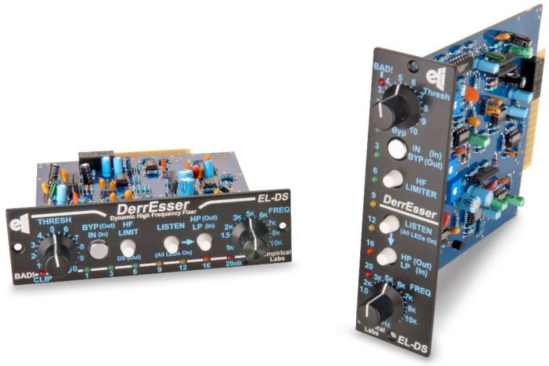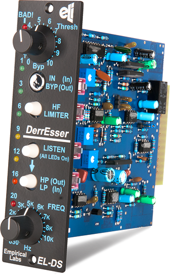 The DerrEsser is a multi function dynamic filtering device, in an API 500 series module format. In its basic “DS” mode, the DerrEsser is an effective, level insensitive de-esser, which is a device that will adjust the high frequency gain on overly trebly or spiky vocal, or other source. By using a crossover technique, and dividing the audio up into a high frequency range and a low frequency range, the DerrEsser can use its Voltage Controlled Amp to turn down comparatively high or harsh high frequencies in an extremely musical manner. However, unlike other de-essers, the device is not limited to just de-essing, and allows for multi use of its circuitry.
