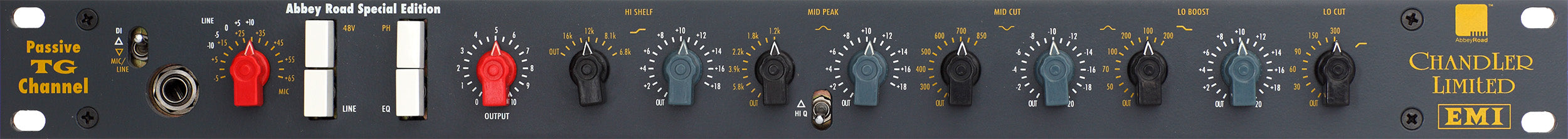 EQ: High Shelf +2 – +18 dB switched (16, 12, 8k2, 6k8 kHz), Mid Peak +2 – +18 dB switched (5k8, 3k9, 2k2, 1k8, 1k2 kHz), Mid Cut -2 – +20 dB (300, 400, 500, 600, 700, 850 Hz), Low Boost +2 – +20 dB switched (50, 70, 100, 200 Hz; 100/200 Hz peak/shelf switchable), Low Cut (Out, 30, 60, 90, 150, 300 Hz)