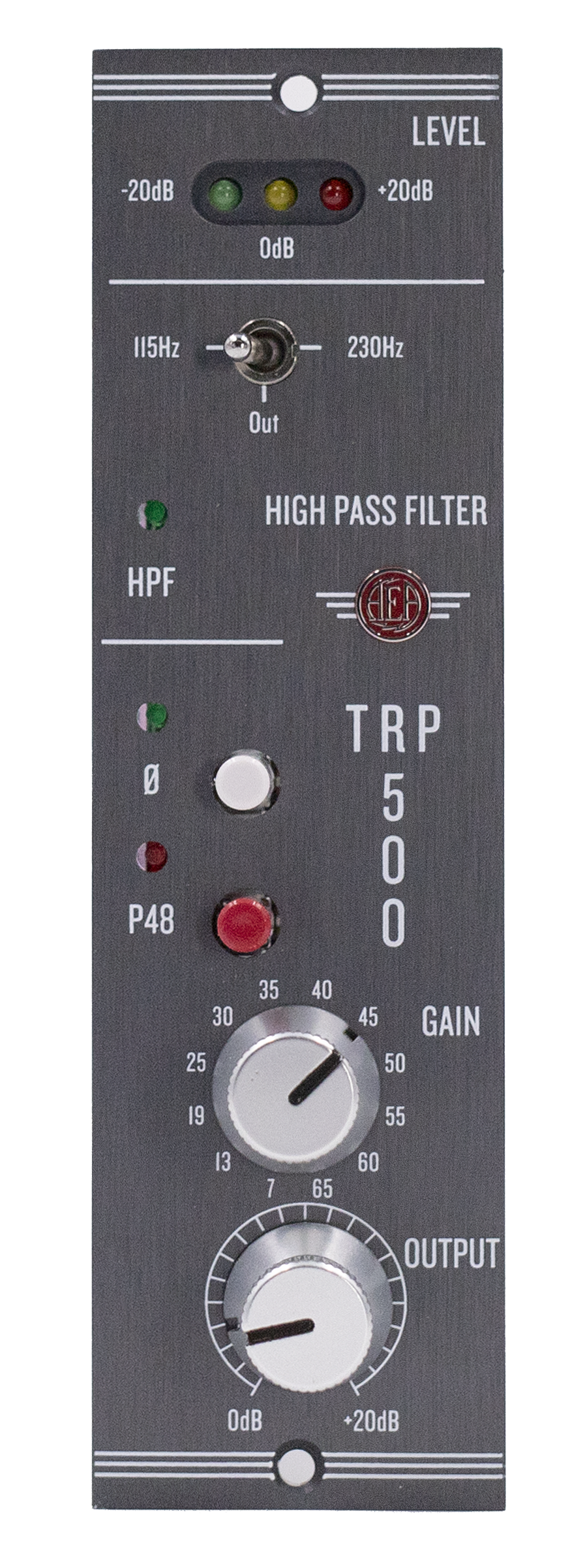 Based on the circuit and topology of the company’s original AEA TRP preamp, the TRP500 has the low noise, musical sonics, and ultra-high gain and impedance (100,000 Ohms) that AEA is renowned for. The TRP500 excels at drawing out the warmth and lush sound of ribbon mics as well as other top-level microphones. With up to 85 dB of quiet DC-coupled gain, minimal path architecture, and a gentle 115 Hz or 230 Hz high pass filter, this preamp puts as little as possible between you and your audience.
