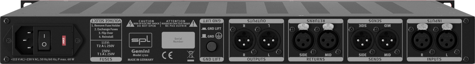 As with all SPL Mastering series gear, the Gemini utilizes 120V Rail technology for ensuring a large amount of headroom and preserving a wide dynamic range. In other words, this unit can handle both incredibly loud and incredibly quiet material without distortion. An IEC power cord is included.