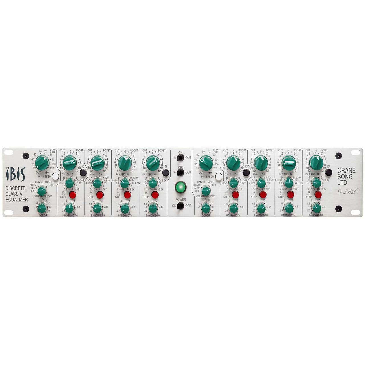 The Crane Song IBIS is a Class-A stereo four-band mastering EQ with a selectable 'colour' switch per band or per channel which gives a depth and warmth to sources, it also has a separate fully variable High Pass Filter. Adding Colour to Band 1 will add warmth, adding colour to Band 3 will add presence and upper mid detail. Adding colour to the high frequencies will add extra 'air'.