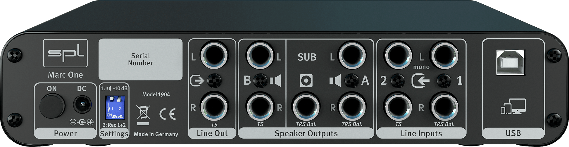 Two analog stereo inputs and one digital USB input can be connected to the Marc One. The DAW (Digital Audio Workstation) is preferably connected via USB.