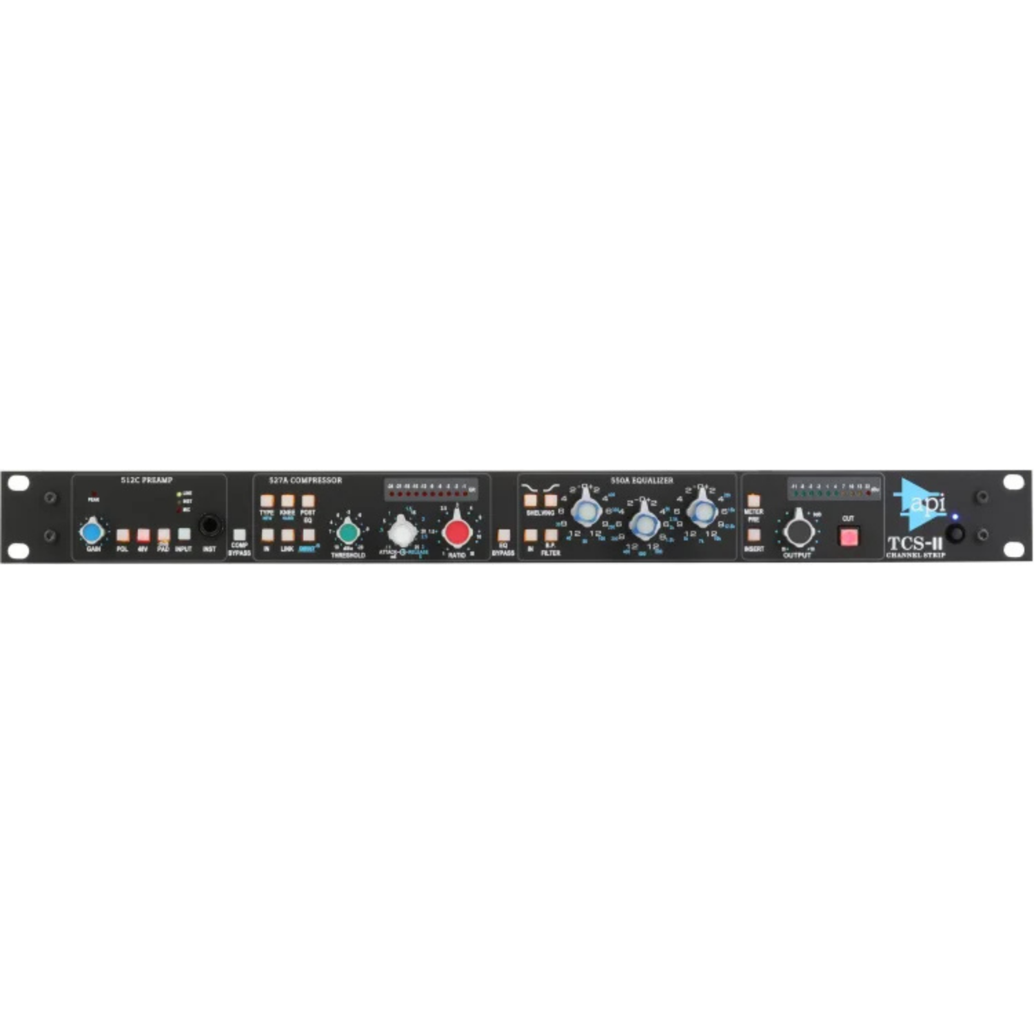 How would you like to put the best features of a large-format API console into your studio rack? With API's The Channel Strip (TCS), you can do precisely that. Now, the API TCS-II upgrades this venerable studio workhorse tool with an updated compressor section, expanded preamp controls, and peak metering for improved performance and operability. This enviable rackmount unit is jam-packed with sections based on classic API modules, including the 512c Mic Preamplifier, the 527A Compressor, the 550A Equalizer, and the 325 Line Driver.