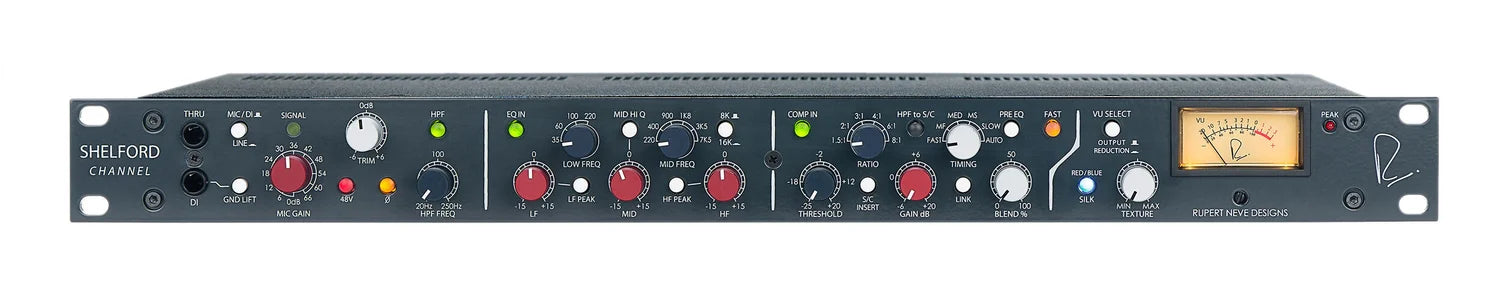 The Shelford Channel is built around Rupert Neve’s first new transformer-gain, class-A microphone preamplifier in over 40 years, a “best-of-the-classics” inductor EQ section, a tone-packed diode bridge compressor, the power of variable Silk saturation, a new dual-tap transformer output stage, and twice the operating voltage of vintage designs.